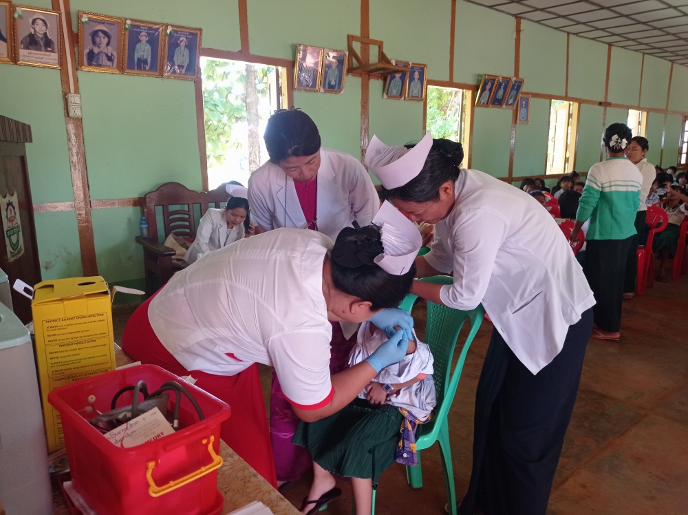 Under the supervision of Dr. Yin Mi Han from the Township Public Health Department, a medical team administered the second dose of the diphtheria vaccine to 99 students aged five to below seven from basic education schools across the township. Additionally, 50 schoolgirls aged nine to below ten received the HPV vaccine as part of the national routine immunization program.