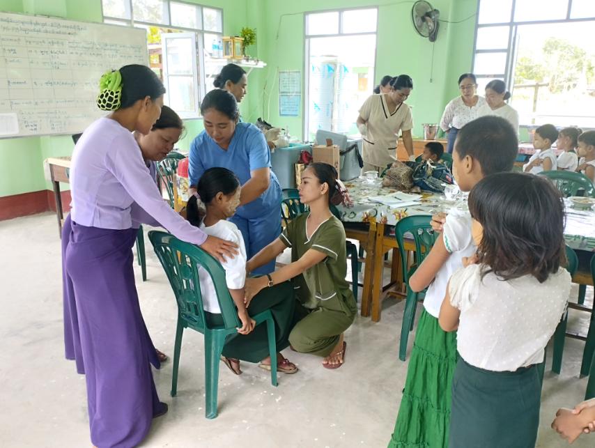 Schoolgirls aged 9 and 12 received the cervical cancer vaccine from a medical team led by Nurse Daw Khi Pa Pa Lwin from the Township Public Health Department. The headmaster, teachers, members of social organizations, and parents also assisted the medical team during the campaign.