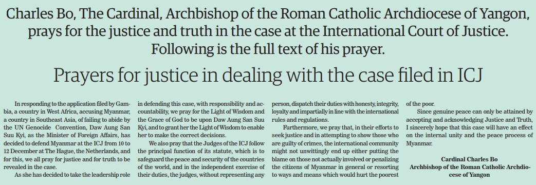 In responding to the application filed by Gambia, a country in West Africa, accusing Myanmar, a country in Southeast Asia, of failing to abide by the UN Genocide Convention, Daw Aung San Suu Kyi, as the Minister of Foreign Affairs, has decided to defend Myanmar at the ICJ from 10 to 12 December at The Hague, the Netherlands, and for this, we all pray for justice and for truth to be revealed in the case.