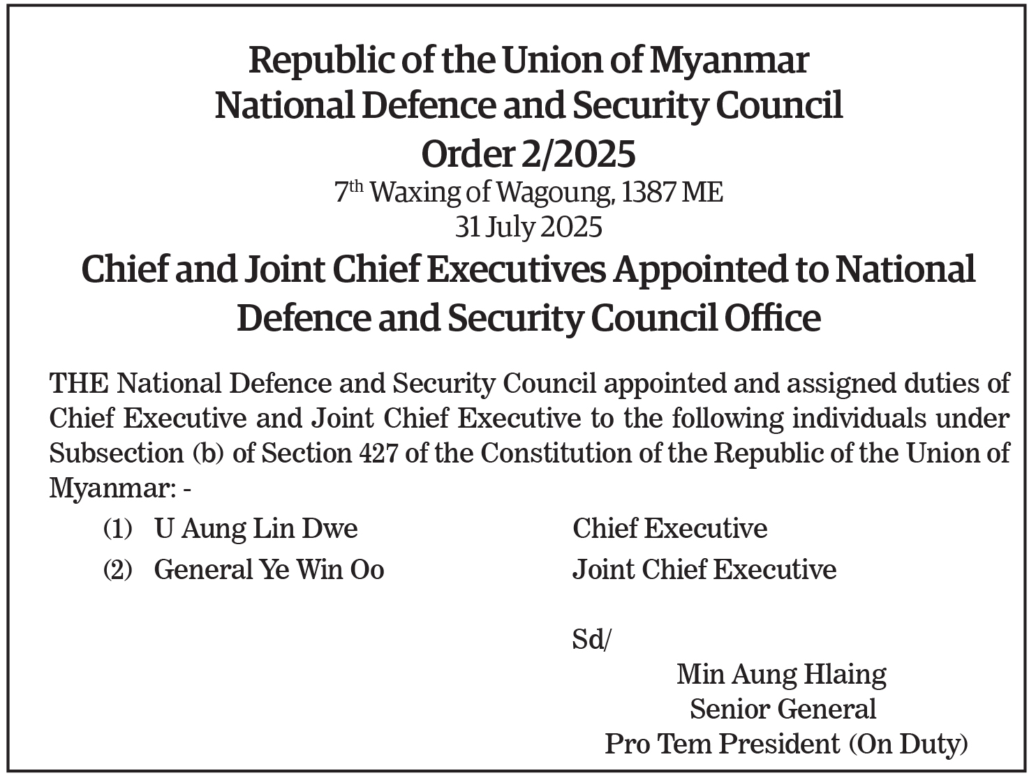 Chief and Joint Chief Executives Appointed to National Defence and Security Council Office