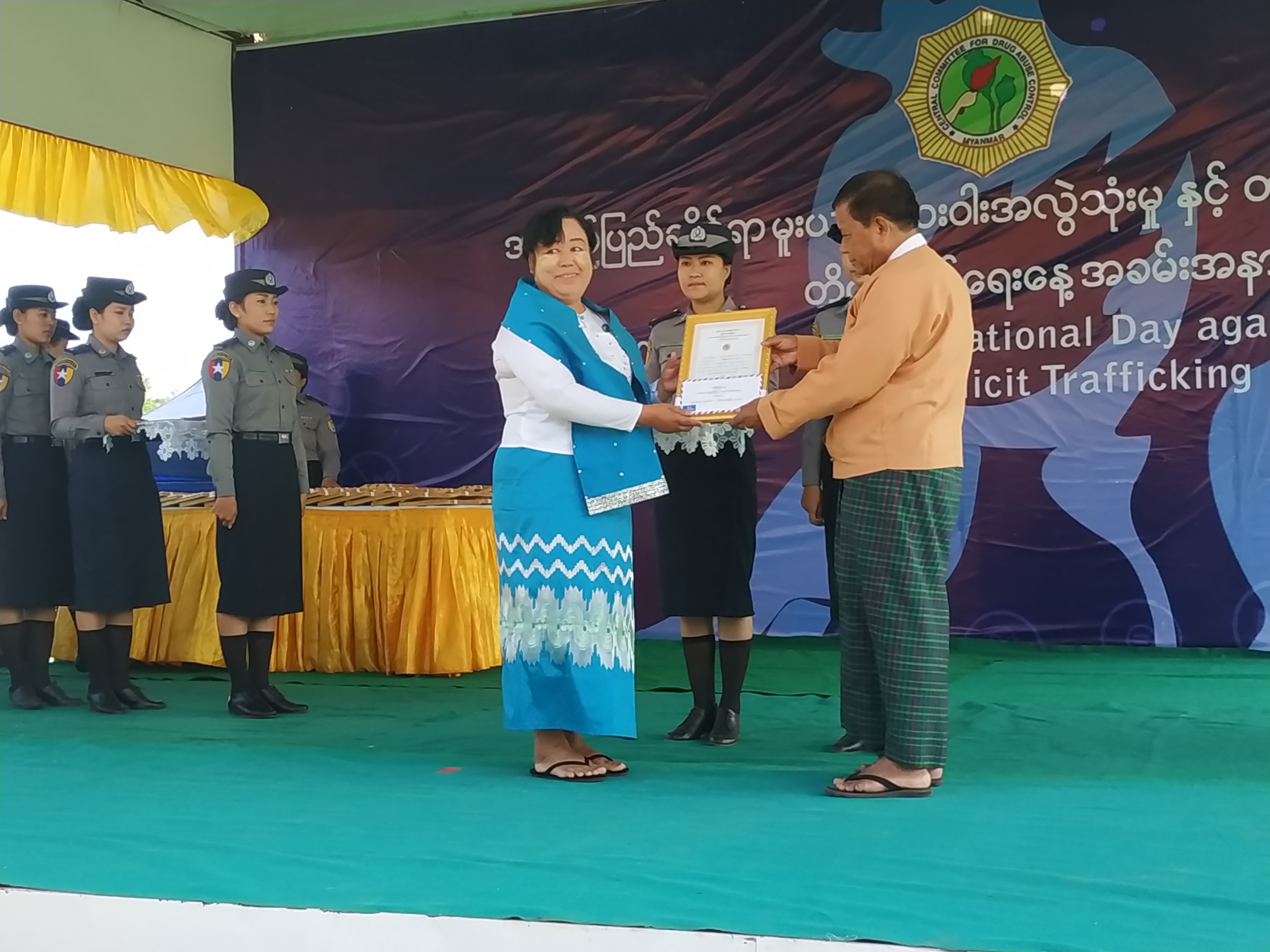 The ceremony, the ninth of its kind was held to mark the 32nd International Day Against Drug Abuse and Illicit Trafficking. At first, Mandalay Regional Chief Minister Dr. Zaw Myint Maung gave an opening speech and Chairman of Mandalay Region Committee for Drug Abuse Control Col Kyaw Kyaw Min read out the message sent by Chairman of the Central Committee for Drug Abuse Control Union Minister for Home Affairs Lt-Gen Kyaw Swe.
