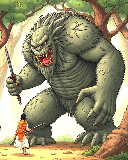 The Prince’s route led him straight into a dreaded forest, the domain of a man-eating Ogre. Despite being warned that anyone who entered was devoured, Panca Vudha was fearless. He confronted the massive Ogre, but the battle quickly turned strange. He used all his five weapons – one after another – yet they all became hopelessly stuck in the Ogre’s incredibly sticky hair or fur. Even after running out of traditional weapons, the Prince’s will was unshakable. He launched himself at the giant, using his hands, feet, and even his head, only to have his limbs stick firmly to the monster’s body. He was completely trapped but still not afraid.