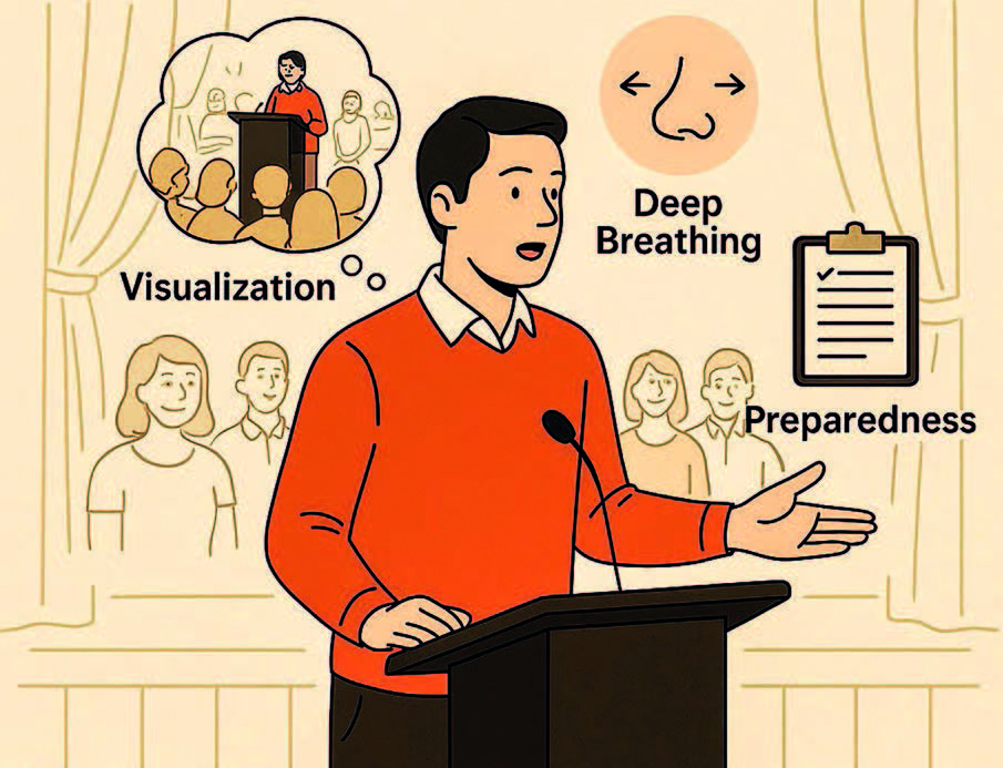 But while understanding the origins of this fear can be helpful, what truly matters is learning how to overcome it. Fortunately, public speaking is not a talent reserved for a select few; it is a skill that can be learned, im­proved, and even mastered over time. With consistent effort and the right strategies, anyone can transform stage fright into stage presence. Three powerful tools: visualization, deep breathing, and thorough preparation, form the foundation for building confidence and controlling anxiety.