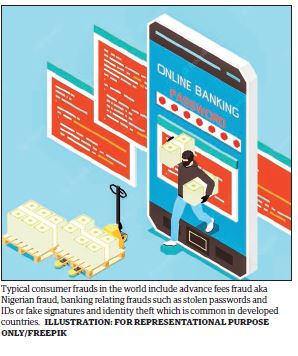 Typical consumer frauds in the world include advance fees fraud aka Nigerian fraud, banking relating frauds such as stolen passwords and IDs or fake signatures and identity theft which is common in developed countries.