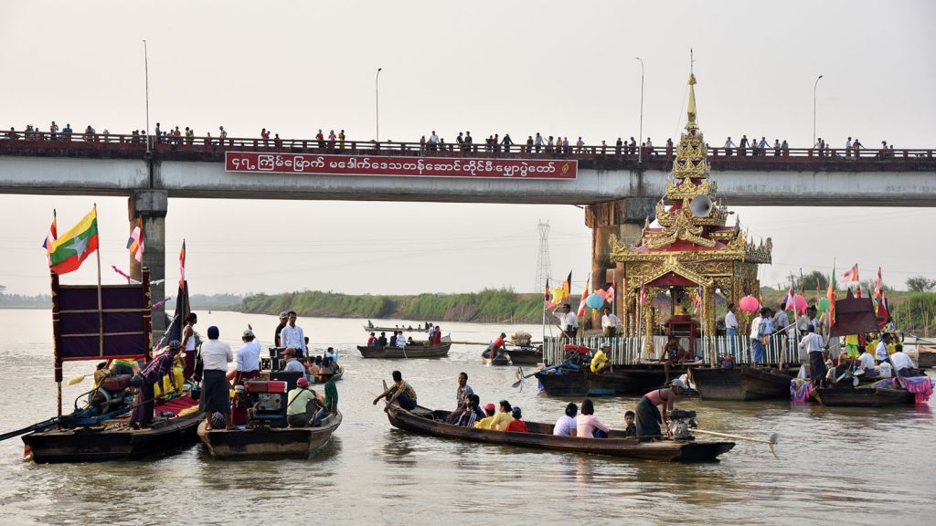 With rains brought on by cyclonic storm ‘Bulbul’ letting up, thousands of locals and visitors gathered yesterday for the annual festival of traditional boat rowing and dances and floating of lamps on the Sittoung River in Madauk, Bago Region.