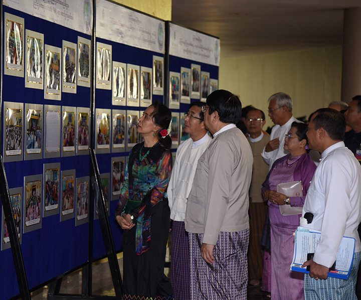 The State Counsellor and the attendees posed for documentary photos before closing the ceremony. After greeting those present at the ceremony, they looked around the displays of documentary photos about inauguration ceremonies of community centres, their activities, public talks and the activities at the centres funded by state/region governments, Hluttaws and private donors, as well as the photos for Chairperson of the foundation and the State Counsellor Daw Aung San Suu Kyi at the community centres, mobile libraries and the vehicles of mobile libraries. The IPRD and the foundation signed an MoU in 2013 to develop an office and a libraries of IPRD’s office in Kawhmu Township, Yangon Region, into a community centre and to collaborate in the mobile library project. A three-year MoU was signed in the 2016-2017 fiscal year to expand the project across the country, which has set up a total of 16 community centres in Kawhmu, Insein, Myaungmya, Natmauk, Dekkina district, Pyinmana, Myitkyina, Mandalay, Hpa-an, Dawei, Loikaw, Sagaing, Mawlamyine, Thandwe, Hakha, Taungoo and Kalaw.