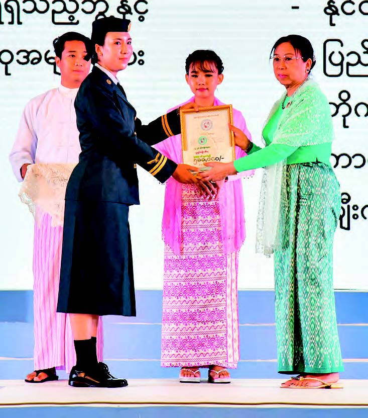 Honorary Patron Daw Khin Thet Htay also presented the honorary medal, certificate and cash award to outstanding female police member Police Lance Corporal Laxmi and outstanding female red cross award winner Daw Lin Lin Htaik while Honorary Patron Daw Than Than Nwe gave the honorary medal, certificate and cash award to female parasports athlete Ma Htet Htet Aye for 2024 and Pitanque sports outstanding athlete Ma Khin Cherry Thet for 2024.