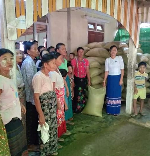 The contribution ceremony was held at a temporary rescue camp opened in the precinct of Shitthoung Pagoda in MraukU yesterday. Daw Nang Moe Ngwe and staff from the DDM presented 117 rice bags to the 393 displaced people from 117 households and gave words of encouragement to them.