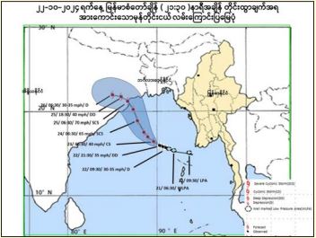 Due to the Deep Depression, rain or thundershowers are likely to be fairly widespresd to widespread in Nay Pyi Taw, Sagaing, Mandalay, Magway, Bago, Yangon, Ayeyawady, Taninthayi Regions and Chin, Rakhine, Kayin, Mon States with likelihood of regionally and isolated heavyfalls and strong winds from tonight up to 24 October 2024.
