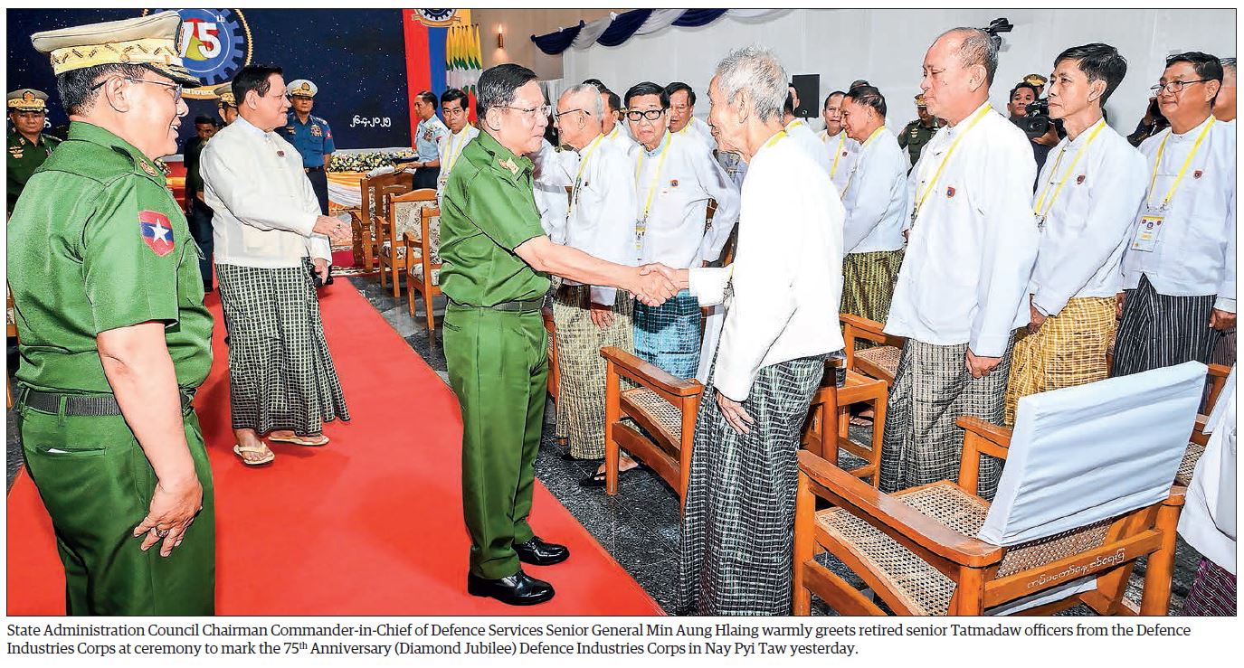 A ceremony to mark the 75th Anniversary (Diamond Jubilee) Defence Industries Corps took place at the local military headquarters in Nay Pyi Taw Council Area yesterday morning, attended by Chairman of the State Administration Council, Commander-in-Chief of Defence Services Senior General Min Aung Hlaing.