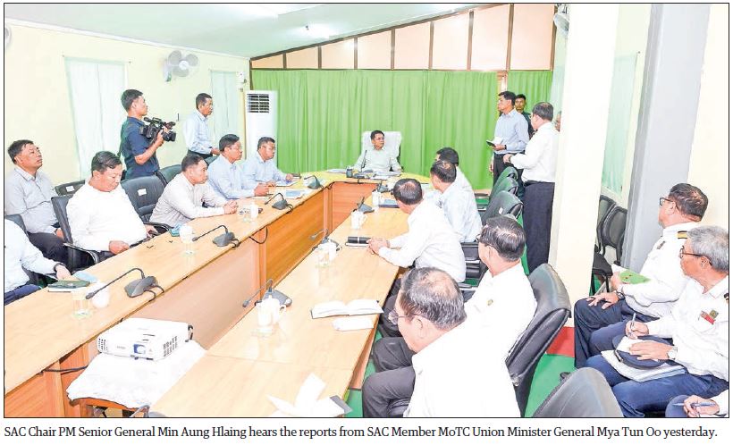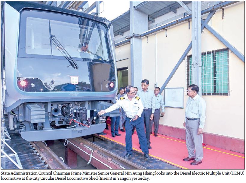 CHAIRMAN of the State Administration Council Prime Minister Senior General Min Aung Hlaing, on his inspection tour of the City Circular Diesel Locomotive Shed (Insein) of Myanma Railways under the Ministry of Transport and Communications yesterday morning, gave guidance to officials to continuously strive to operate electric multiple unit (EMU).