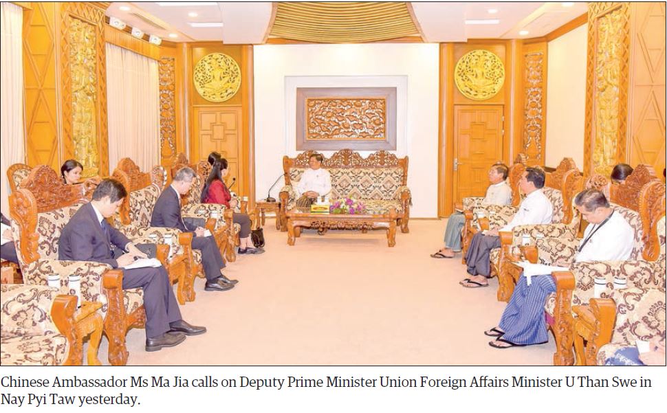 Deputy Prime Minister and Union Minister for Foreign Affairs of the Republic of the Union of Myanmar U Than Swe received Ms Ma Jia, Ambassador Extraordinary and Plenipotentiary of the People’s Republic of China to Myanmar, at the Ministry of Foreign Affairs in Nay Pyi Taw yesterday.