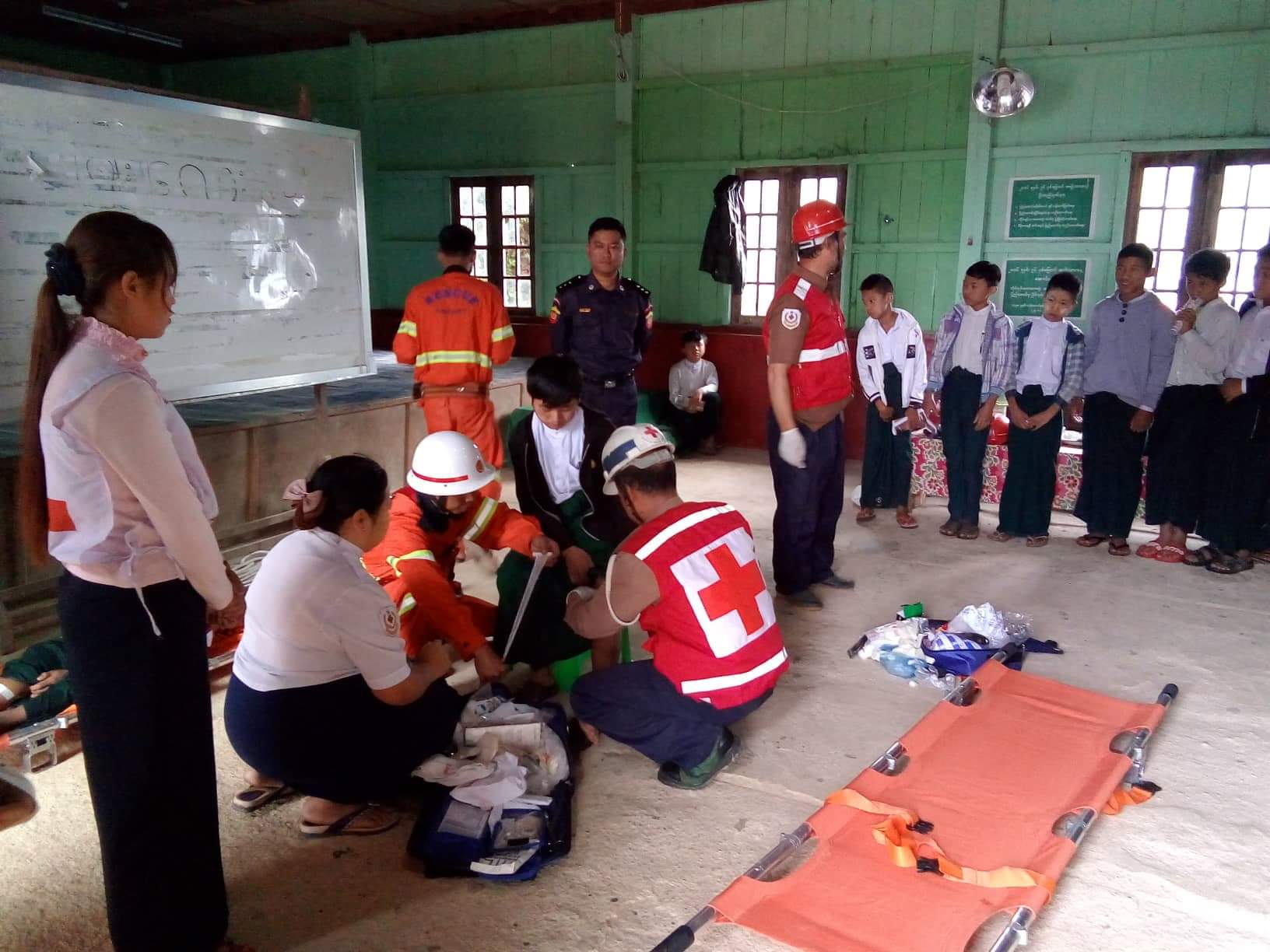The Fire Services Department (FSD) and the Myanmar Red Cross Society (MRCS) jointly organized a natural disaster preparedness drill at the Nawarat Hall of the basic education high school (1) in Namsang Township, Palaung Self-Administered Zone in Shan State yesterday morning.