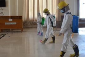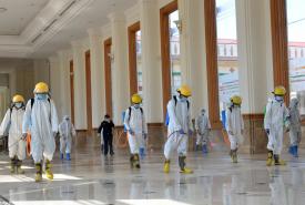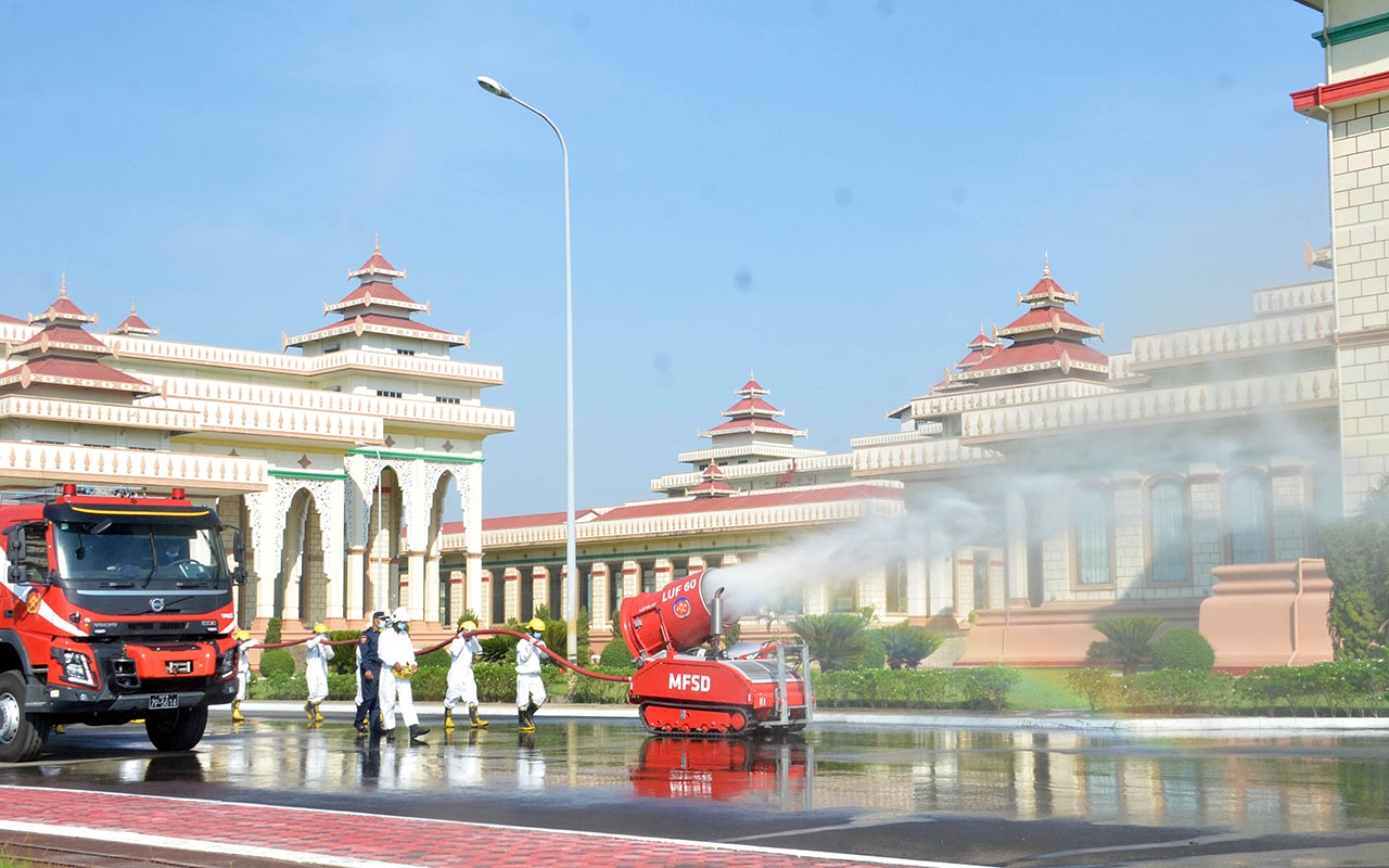 Meeting halls and dining rooms were disinfected by 20 Defence Service personnel and 80 members of Nay Pyi Taw Fire Services Department, using 4 disinfecting vehicles, 6 fire engines, 2 water tankers and 2 Robotic Fire Fighting (LUF 60) vehicles.