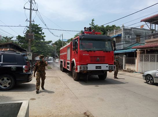 On 9th May, a combined team comprised of military personnel and fire fighters sprayed disinfectant in ward 4, 8 and 13 in the township.—Nay Htet Aung