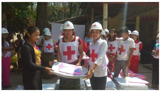 Members of the Red Cross handed over 37 pieces of waterproof canvas and 70 treated mosquito nets to the 37 households who fled “Ywahaungtaw” village and are now taking refuge in the camp.— District IPRD