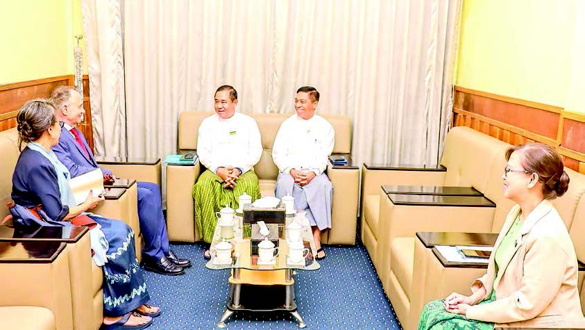 UNION Minister for Home Affairs and First Vice-Chair of the National Disaster Management Committee Lt-Gen Tun Tun Naung, and Union Minister for Social Welfare, Relief and Resettlement and Second Vice-Chair Dr Soe Win met Mr Marcoluigi Corsi, outgoing UN Resident and Humanitarian Coordinator and UNICEF Representative to Myanmar, at the Disaster Management Centre guest hall yesterday afternoon.