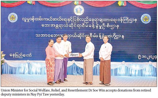 A donation ceremony for the flood-affected regions was held yesterday afternoon at the meeting hall of the Disaster Management Centre under the Ministry of Social Welfare, Relief, and Resettlement. Union Minister for Social Welfare, Relief, and Resettlement Dr Soe Win attended the event, accepted the donations, expressed his gratitude, and presented certificates of appreciation to the appreciation.