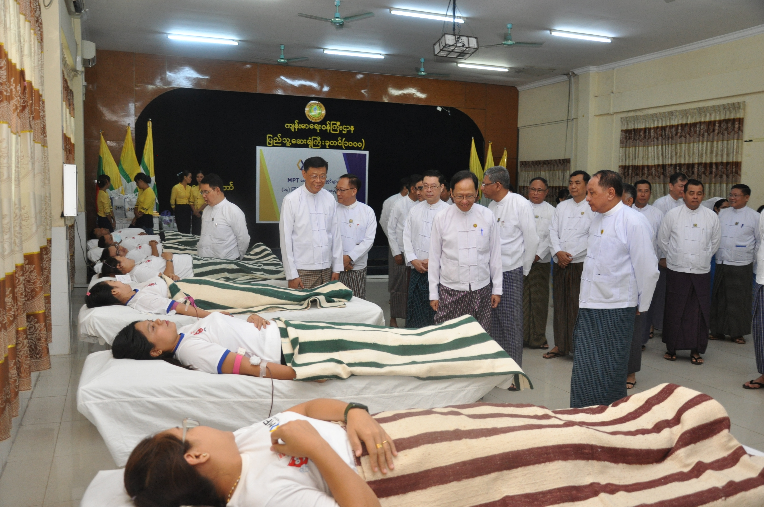The 14th collective blood donation event of the Myanma Posts and Telecommunications under the Ministry of Transport and Communications was held yesterday at the Nay Pyi Taw General Hospital (1,000-bed). Deputy Prime Minister and Union Minister General Mya Tun Oo, Union Minister for Health Dr Thet Khaing Win, deputy ministers and heads of department attended the ceremony.