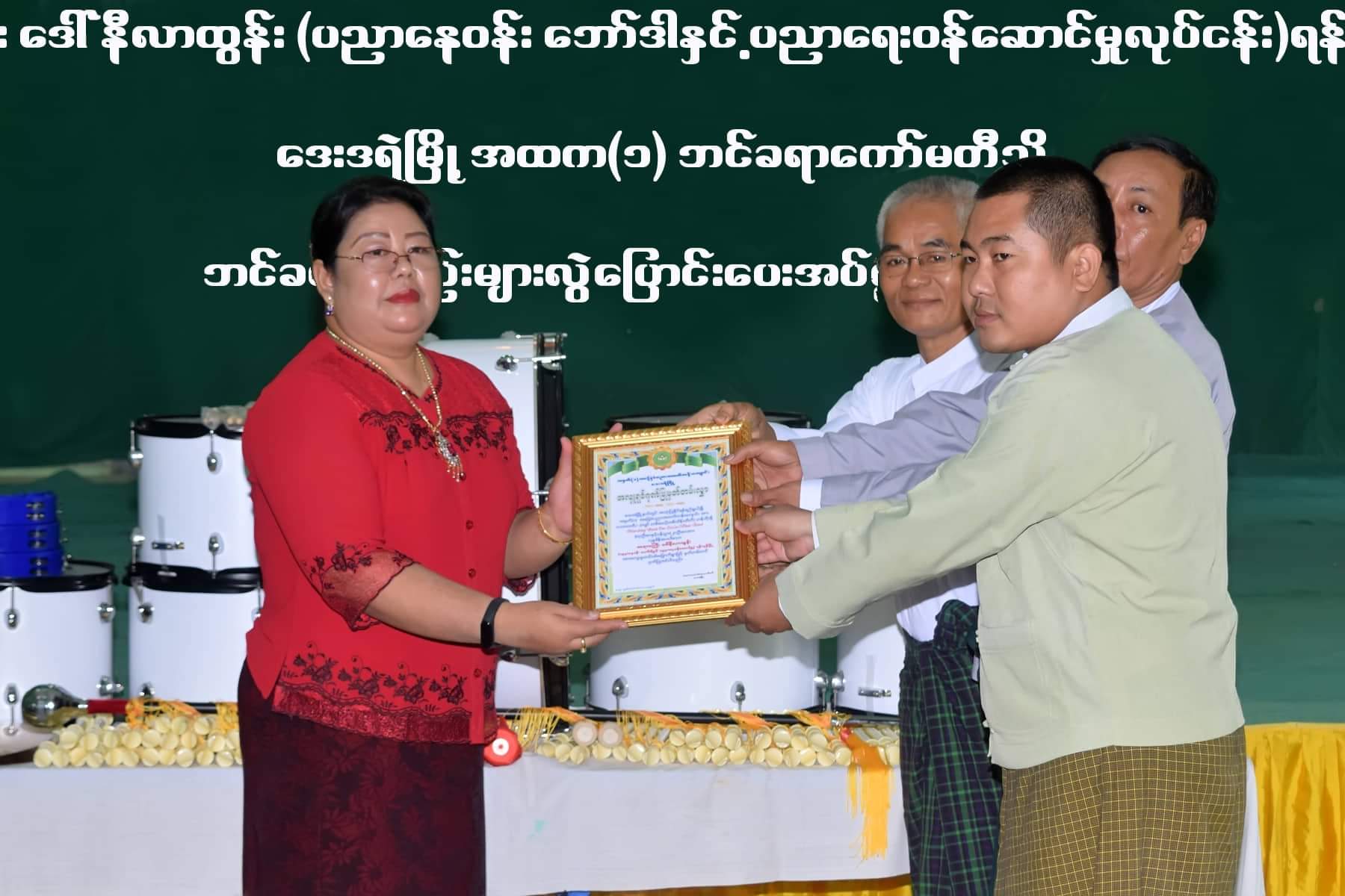 At the event, headmaster of B.E.H.S-1 U Thei Kywe delivered an opening speech, and Donor Daw Ni lar, the old student of B.E.H.S-1, clarified the purpose of the donation of drums and related items for B.E.H.S-1 and handed over drums and related items worth K 1.1 million to chairman of the school development committee U Zaw Win.