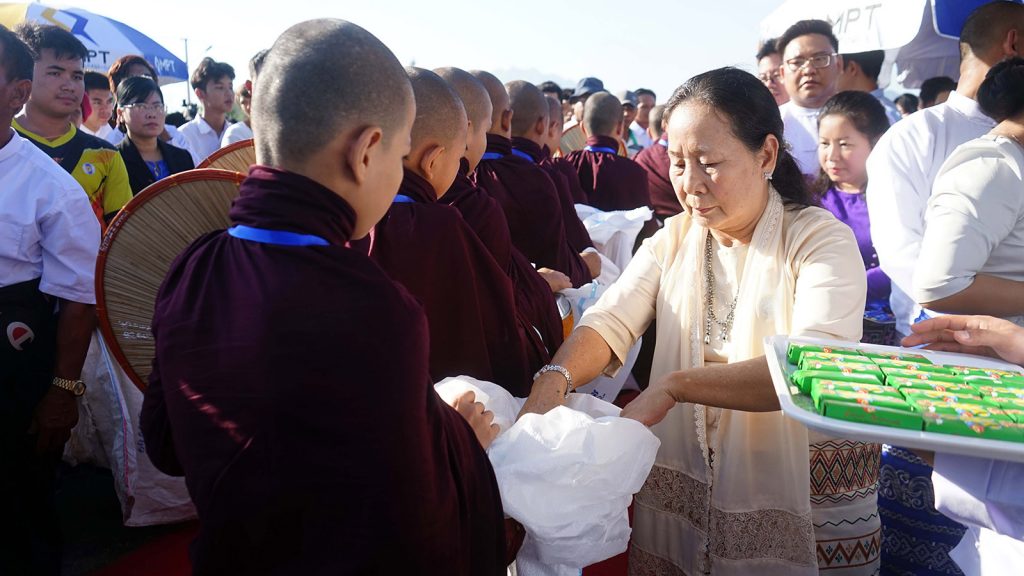Afterwards, Amyotha Hluttaw Speaker Mahn Khaing Than’s wife Daw Nant Kyin Kyi, Union Minister Thura U Aung Ko and donors donate dry ration and donations to State Sanghamahanayaka Sayadaws, 5,000 Sanghas and nuns from townships in Kayin State.