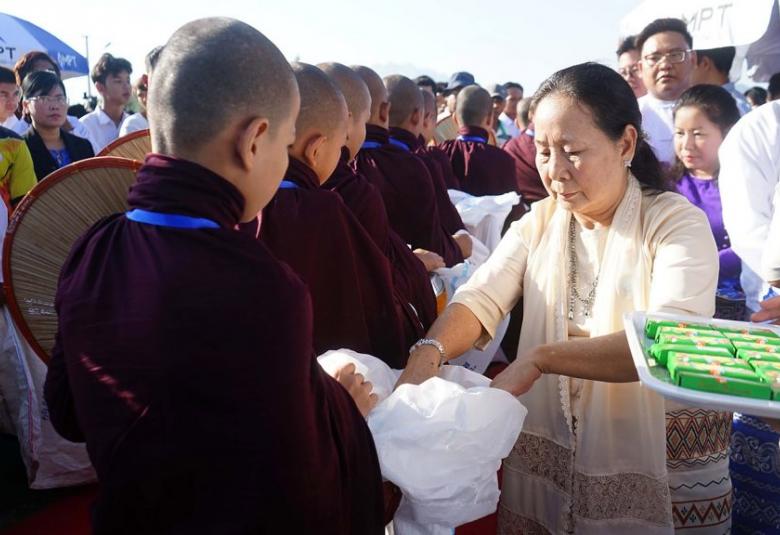 A dry ration donation to 5,000 Sanghas and nuns jointly organized by Kayin State government, departments, town elders and donors was held at Hpa-An airfield yesterday morning.