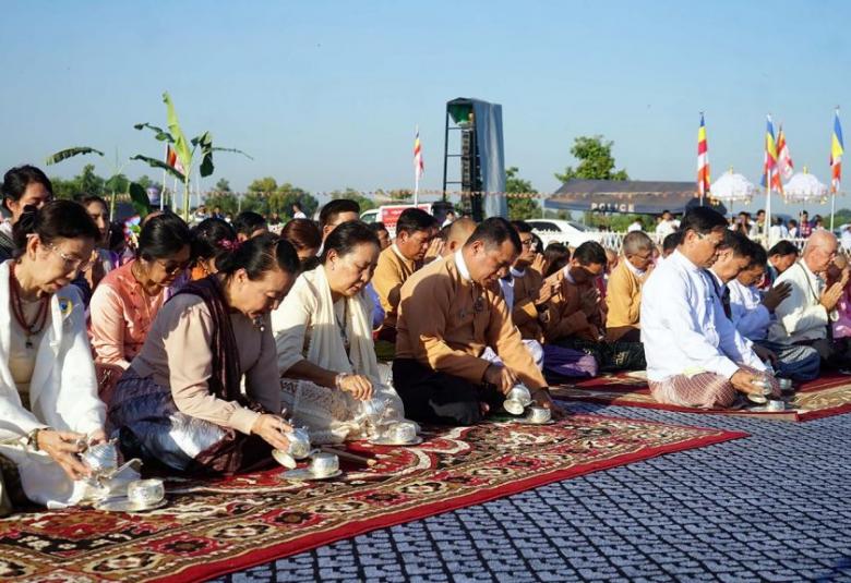 At the event Amyotha Hluttaw Speaker Mahn Win Khaing Than’s wife Daw Nant Kyin Kyi, Union Minister for Religious Affairs and Culture Thura U Aung Ko, Kayin State Chief Minister Nan Khin Htwe Myint, Taninthayi Region Chief Minister U Myint Maung, Kayin State Hluttaw Speaker U Saw Chit Khin and guests took the five precepts from State Sanghamahanayaka Vice Chairman Nyaungshwe Town Mongthauk monastery patron Sayadaw Abhidhaja Maharahtaguru Bhaddanta Thumingala and listened to parittas recitation by the Sanghas and nuns.