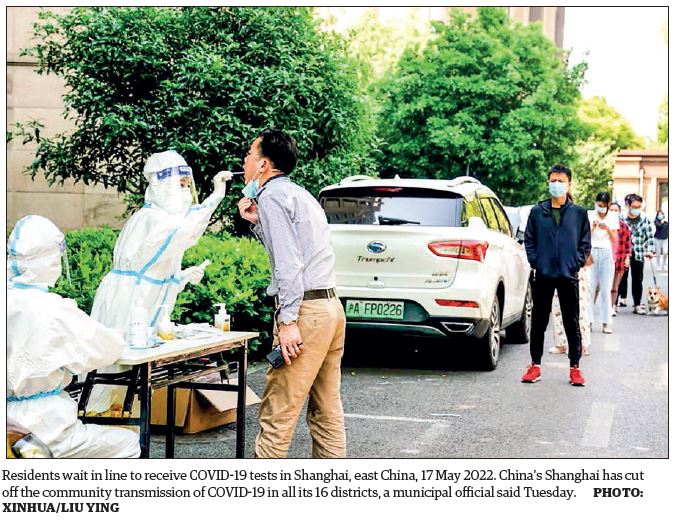 China’s financial hub Shanghai has cut off the com­munity transmission of COV­ID-19 in all of its 16 districts and is seeing more factories return to normal operations and businesses reopen.