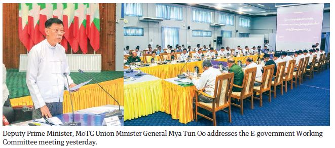 Deputy Prime Minister Union Minister for Transport and Communications General Mya Tun Oo, in his capacity as Chairman of the Working Committee, said concerted efforts must be made to suc­cessfully gain the achieve­ments in e-government devel­opment programmes set out in the Myanmar e-government Master Plan 2030. In doing so, it includes building ICT In­frastructure, e-procurement and government and private collaboration, training skilled personnel, setting standards, conducting research, releas­ing information and engaging in international cooperation. Moreover, it is essential to coordinate rapidly advancing public electronic services and accelerating e-government.