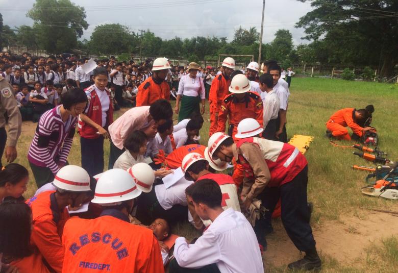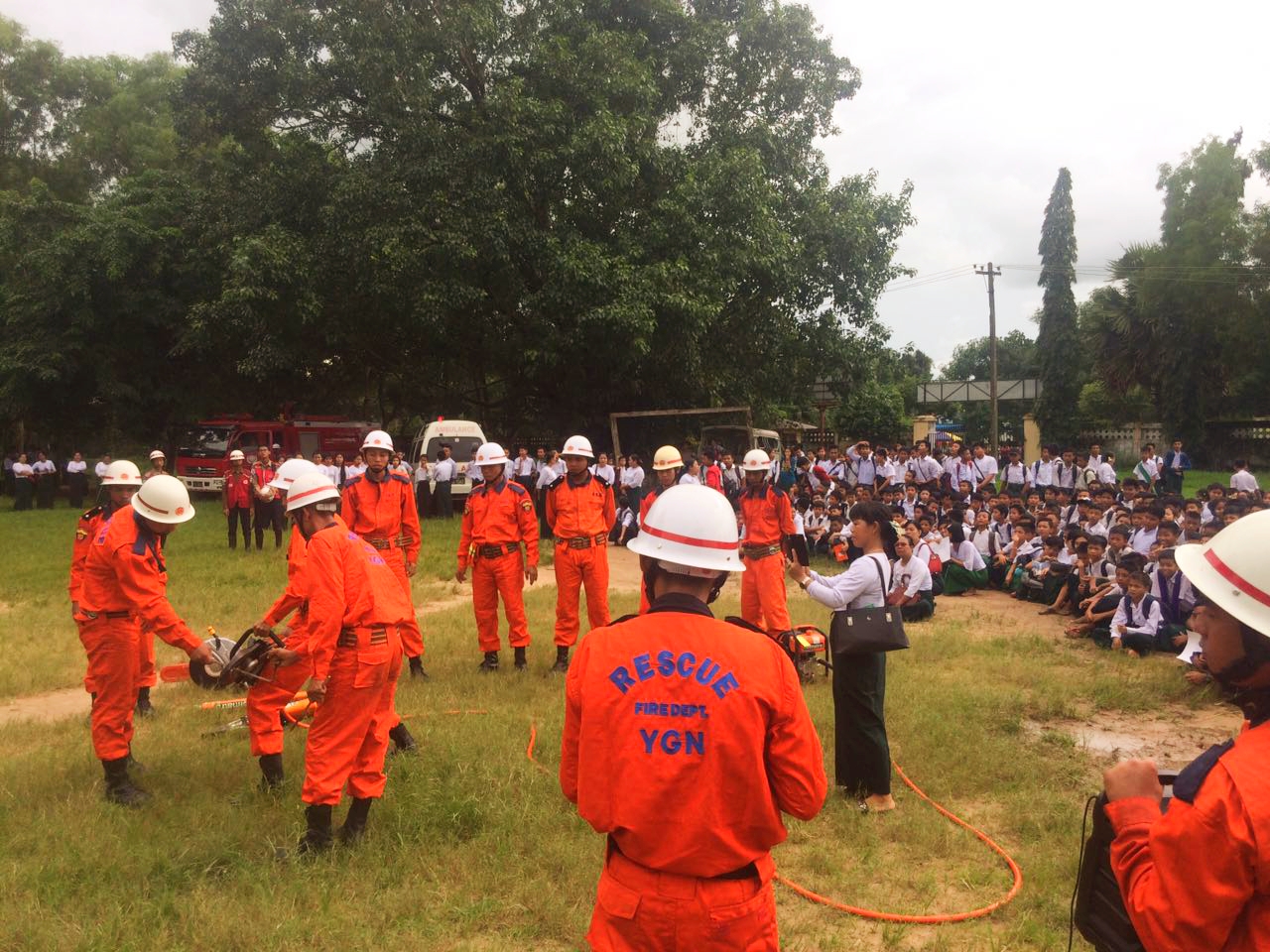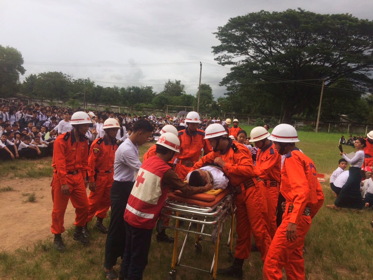 The Fire Services Department (FSD) and the Myanmar Red Cross Society (MRCS) jointly organized a natural disaster preparedness drill in the compound of the basic education high school (1) (Inndaing) in Hlegu Township, Yangon Region on 19 August.