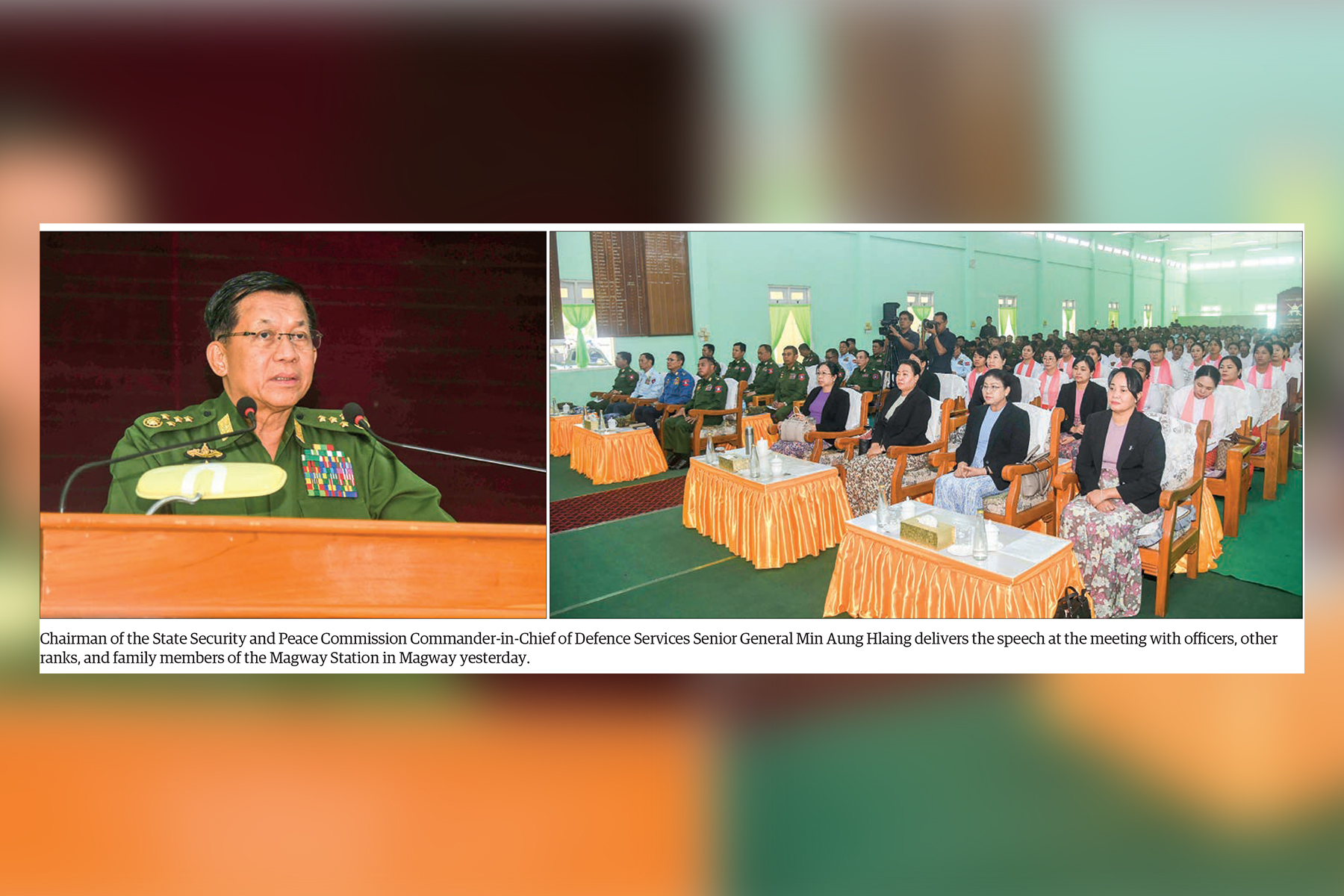 Chairman of the State Security and Peace Commission and Commander-in-Chief of Defence Services Senior General Min Aung Hlaing met officers, other ranks and families of Magway Station under the Central Command at Thiha Thura Kyin San Hall of the local battalion headquarters in Magway yesterday afternoon.