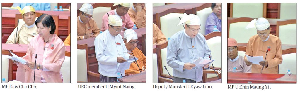 As a final agenda of the day a motion tabled by U Zaw Min Thein of Laymyethna constituency urging the Union Government to fulfil more requirements when implementing rural road and bridge construction works was discussed by U Hla Tun Kyaw of Maungtaw constituency, U Nay Heat Win of Sinbaungwe constituency, Daw Mya Khwa Nyo Oo of Shwedaung constituency, U Than Aung of Ngaputaw constituency, U Soe Aung Naing of Kyonpyaw constituency, U Kyaw Gyi @ U Ohn Khin of Minhla constituency, Daw Khin Than Nu of Mindon constituency, Daw Cho Cho of Ottwin constituency, U Nan Mon Htin of Machanbaw constituency, U Myint Oo of Thanatpin constituency, U Win Htut of Pyapon constituency, U Zaw Min Lwin of Madaya constituency, U Arr Moe Si of Khaunglanphu constituency, U Kyaw Myo Min of Moenyo constituency and U Thein Tun of Kyaunggon constituency.