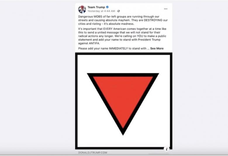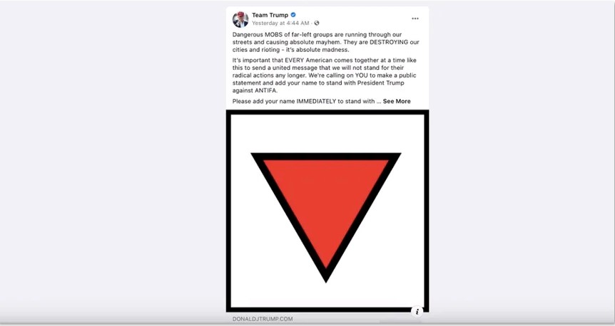 "The inverted red triangle is a symbol used by antifa, so it was included in an ad about antifa," Tim Murtaugh, a spokesman for the Trump campaign, said in a statement.