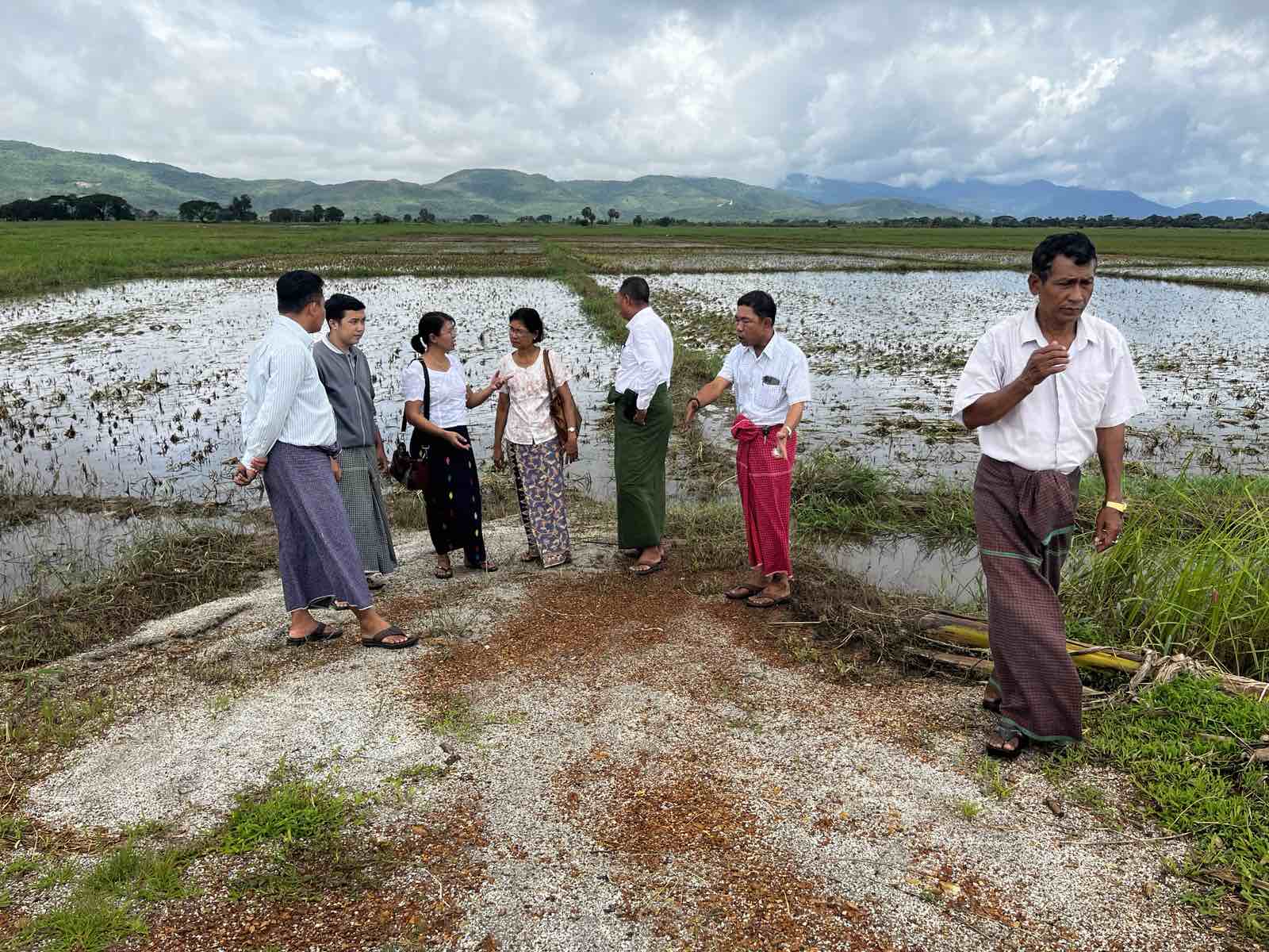Officials made a field trip this morning to inspect farmland submerged by a torrential downpour in villages in Paung Township of Mon State.