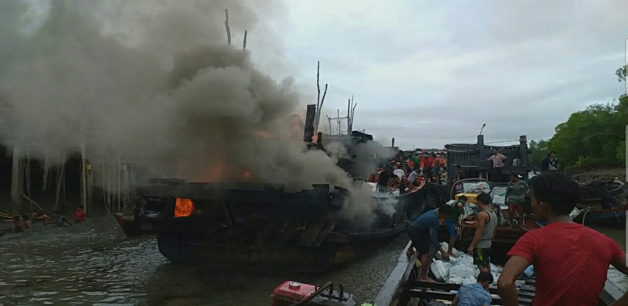 A passenger boat named “Aung Myat Min” belonging to a man identified as U Htay Aung from Ngamannchaung Taung Village caught fire when some workers were loading goods. The fire is believed to have started from an overheated wire shock. The ferryboat is 57 ft. long, 15 ft. wide and 6 ft. draught.