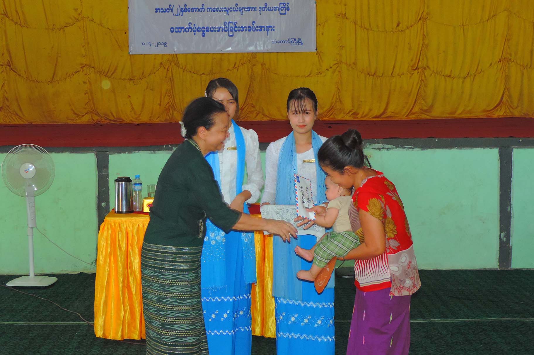 Afterwards, the chief minister and party attended cash donation ceremony to pregnant women and children under two-year old, held at Pathi Hall in Thandaung Town, where the State Chief Minister gave opening remarks. The State Chief Minister and party furnished a total of K 84,330,000 to 1874 people including pregnant women and children at a rate of K 45,000 per head.