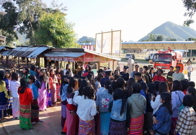 A fire drill was conducted in conjunction with a knowledge sharing event about the natural disaster at a market in Dimawhso Township, Kayah State yesterday evening.