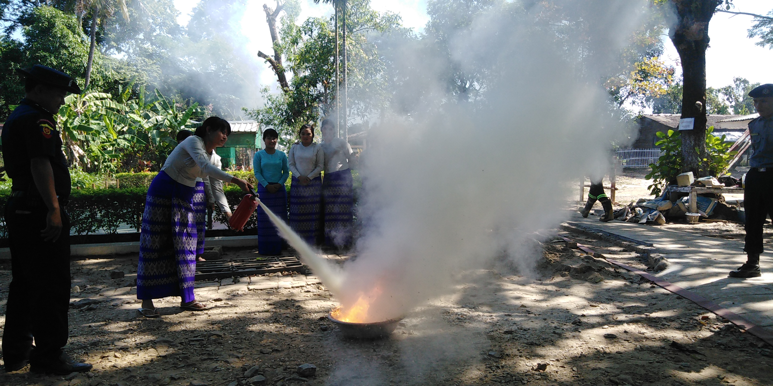 At first, the commander of the township fire brigade U Zaw Myo Htay disseminated knowledge about the risks of fire. Next, firefighters demonstrated how to use fire extinguishers when a fire breaks out in the area. Afterwards, demonstrated how to use fire extinguishers and conducted the first aid drill by using fire engines, water tankers and fire extinguishers.