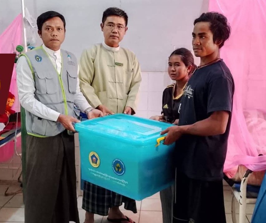 A total of 880,000 kyats was given, including 650,000 kyats for the three victims and 230,000 kyats each for building materials and food, along with 17 types of consumer goods.