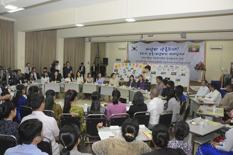 U Aung Ko Ko Lat who graduated with Korean language, Mr Jang Young Sung who graduated with Myanmar language and Korean language students shared their experiences in learning the two languages.