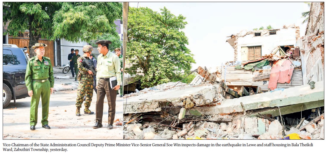 The Vice-Senior General inspected damage in the earthquake in Lewe and staff housing in Bala Theikdi Ward of Zabuthiri Township and viewed rescue and relief operations.