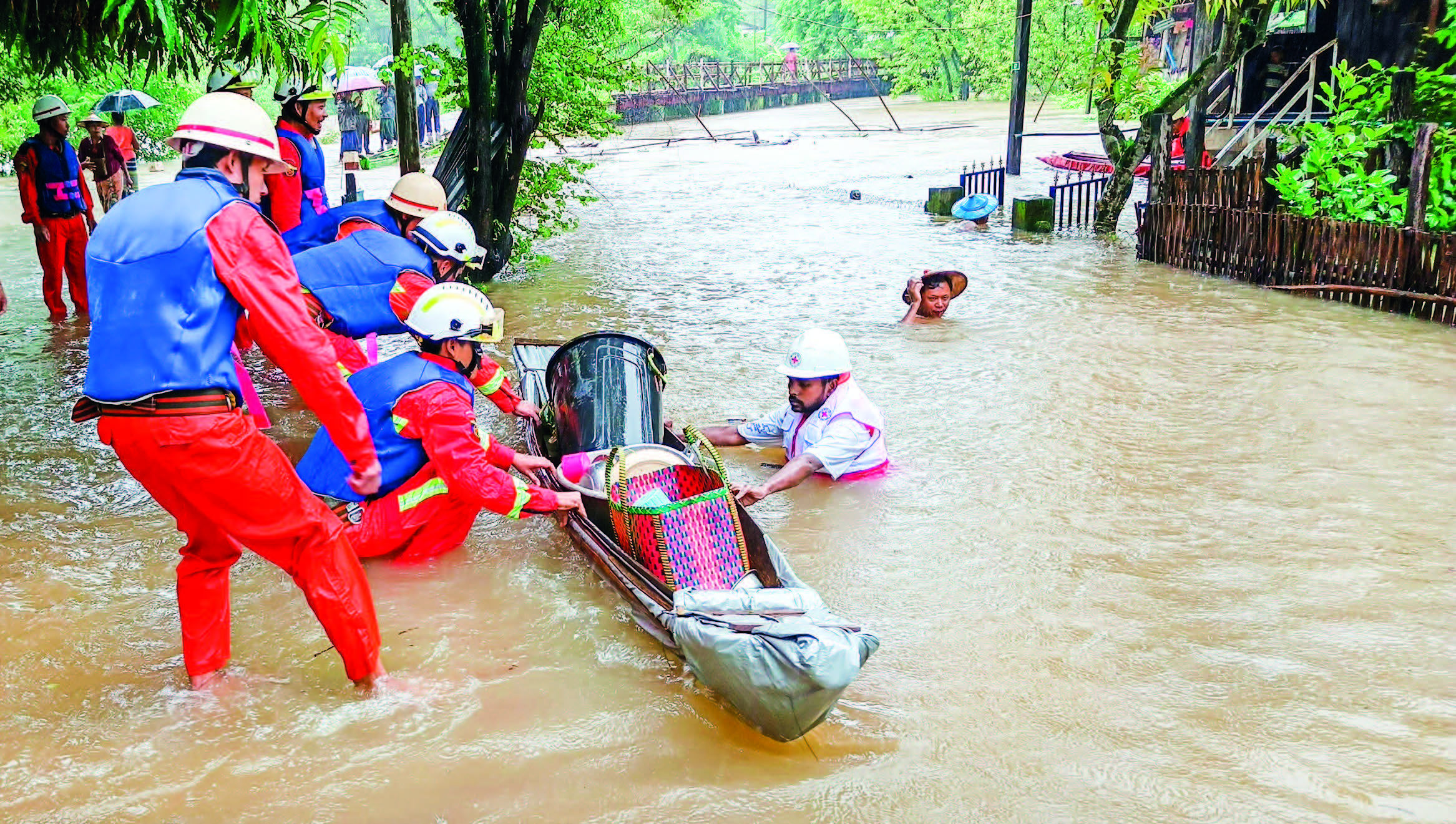 Volunteers from charity associations, Tatmadaw members, members of auxiliary fire brigades, members of Myanmar Police Force and service personnel from relevant departments carry out rescue and relief measures under the supervision of relevant disaster management bodies in regions and states while health personnel perform necessary healthcare services and prevention of infectious diseases for the people from flood-ravaged areas.
