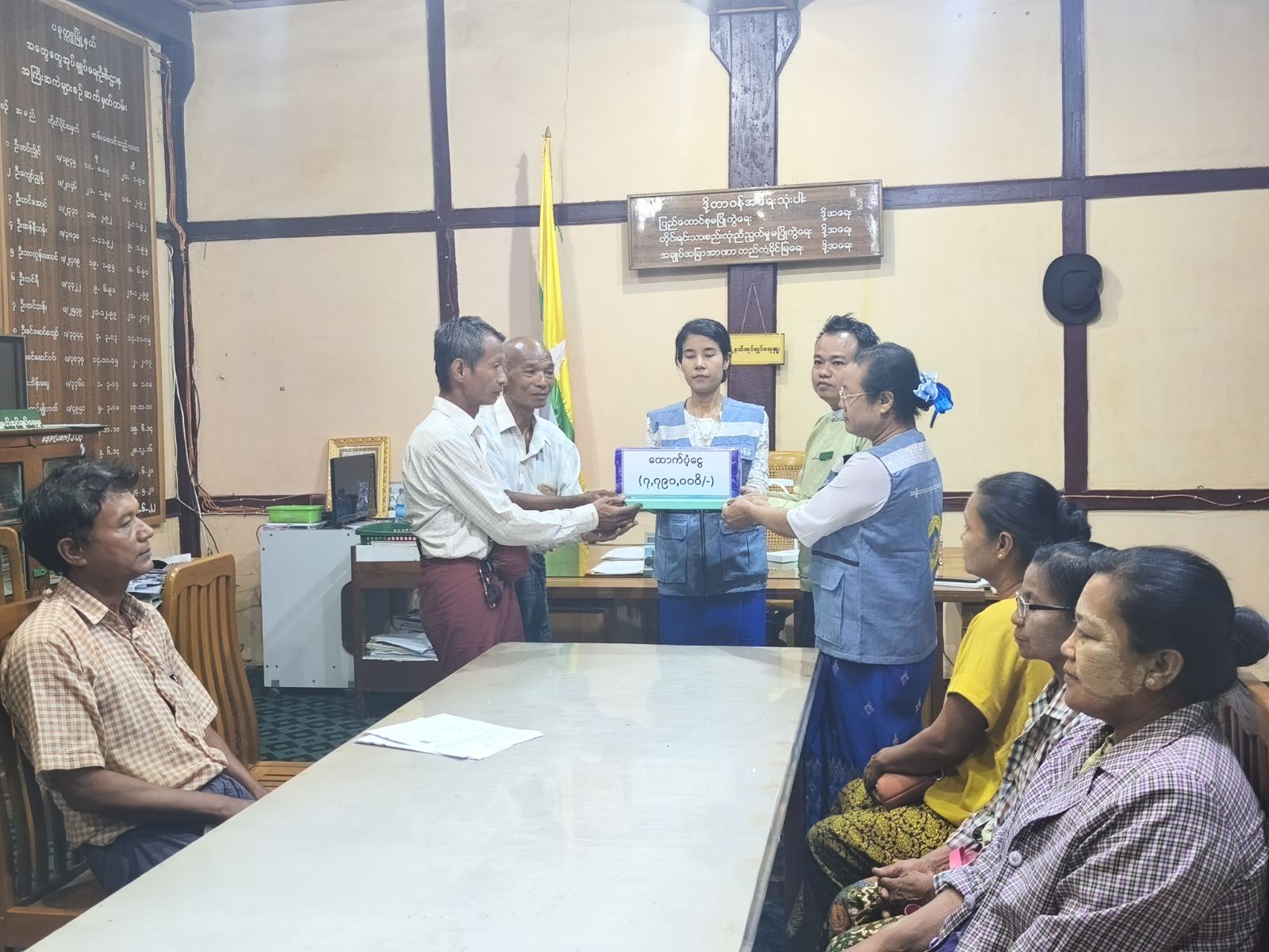 A total of 258 people from 65 households in Tengat Village Tract, Letpan Khon Village, Htaung Kone Village, and Leyar East and West Villages received Ks 6.5 million for housing materials and Ks 1.29 million for rice, totaling Ks 7.79 million, according to U Hein Htet Aung, Deputy Township Administrator of the General Administration Department.