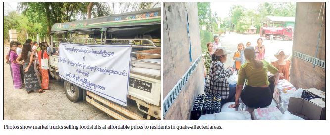 UNDER the arrangement of the Ministry of Commerce and the Union of Myanmar Federation of Chambers of Commerce and Industry (UMFCCI), market trucks have been selling rice, oil, salt, pulses, fish paste and various goods directly to earthquake-affected staff housings in Nay Pyi Taw, Sagaing and Mandalay since 30 March.