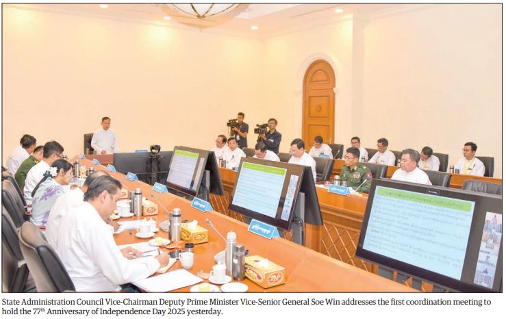 Chairman of the Central Committee for Organizing the 77th Anniversary of Independence Day 2025 Vice-Chairman of the State Administration Council Deputy Prime Minister Vice-Senior General Soe Win said so at the first coordination meeting to hold the 77th Anniversary of Independence Day 2025 at the Office of the SAC Chairman in Nay Pyi Taw yesterday afternoon.