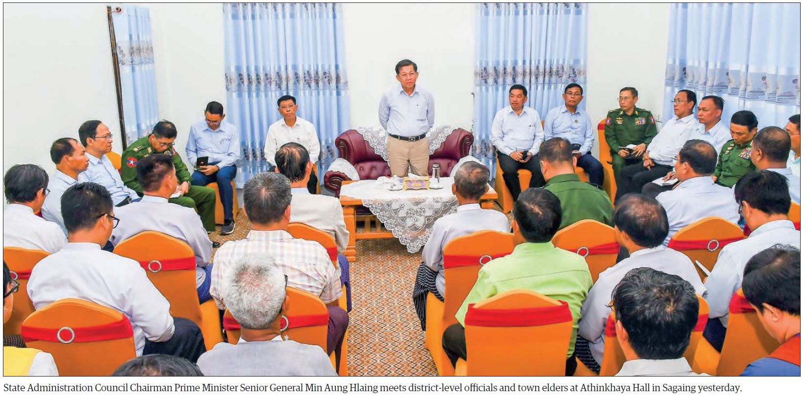 Chairman of the State Administration Council Prime Minister Senior General Min Aung Hlaing yesterday met district-level officials and town elders at Athinkhaya Hall in Sagaing and at the office of the Mandalay Region government in Mandalay separately to talk about rehabilitation for loss and damage to the regions in the earthquake.