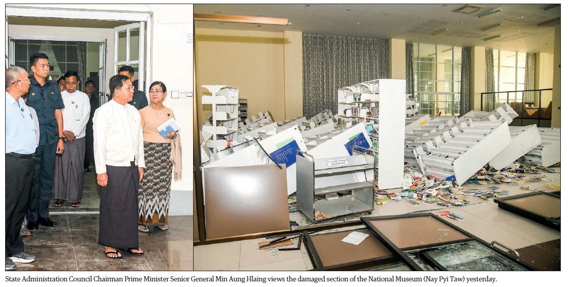 Chairman of the State Administration Council Prime Minister Senior General Min Aung Hlaing, accompanied by Council Joint Secretary General Ye Win Oo, Union ministers and the Nay Pyi Taw Council chairman, yesterday afternoon inspected the National Museum (Nay Pyi Taw) damaged by the Mandalay earthquake.