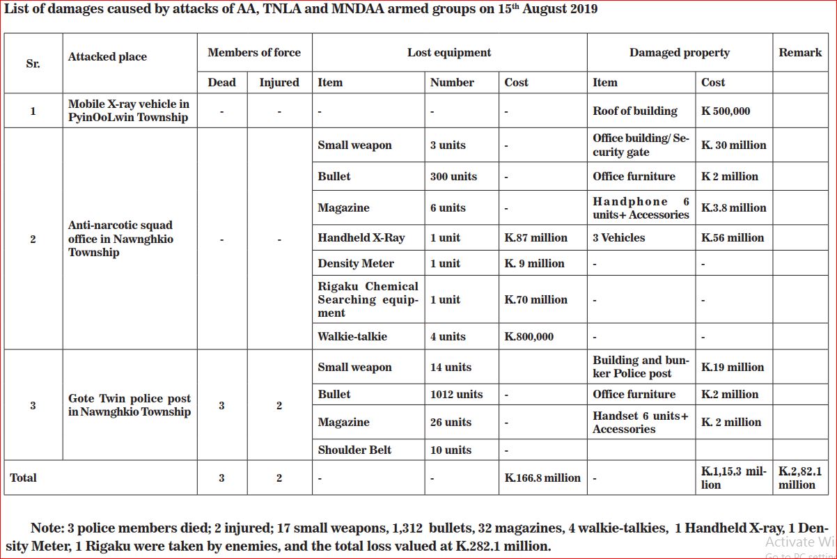 U Zaw Htay said the attacks in Nawnghkio killed nine soldiers, three police officers and three civilians while leaving a soldier, two police officers and ten civilians wounded. He said they attacks have cost more than K200 million losses in arms and ammunitions for the Defence Services Technology Academy and Myanmar Police Force.