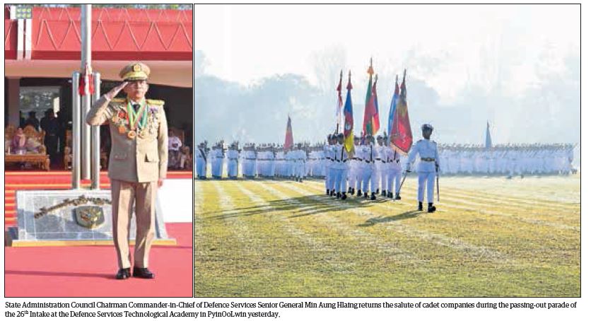 Chairman of the State Administration Council Commander-in-Chief of Defence Services Senior General Thadoe Maha Thray Sithu Thadoe Thiri Thudhamma Min Aung Hlaing delivered a speech at the passing out parade of the 26th Intake of Defence Services Technological Academy at the DSTA parade ground in PyinOoLwin yesterday morning.