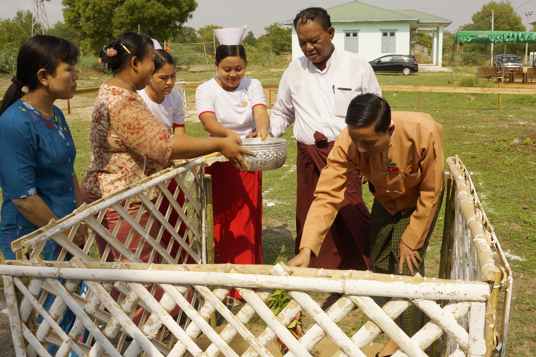 MP U Tun Tun Win of Pyithu Hluttaw, District Administrator U Ohn Than, MP U Zaw Win and U Aung Myo Oo of regional Hluttaw, Township Administrator U Zaw Min Han and Dr. Myint Myint Maw from the Township Department of Public Health drove stakes at the designated places to construct the building and sprinkled the scented water on it.